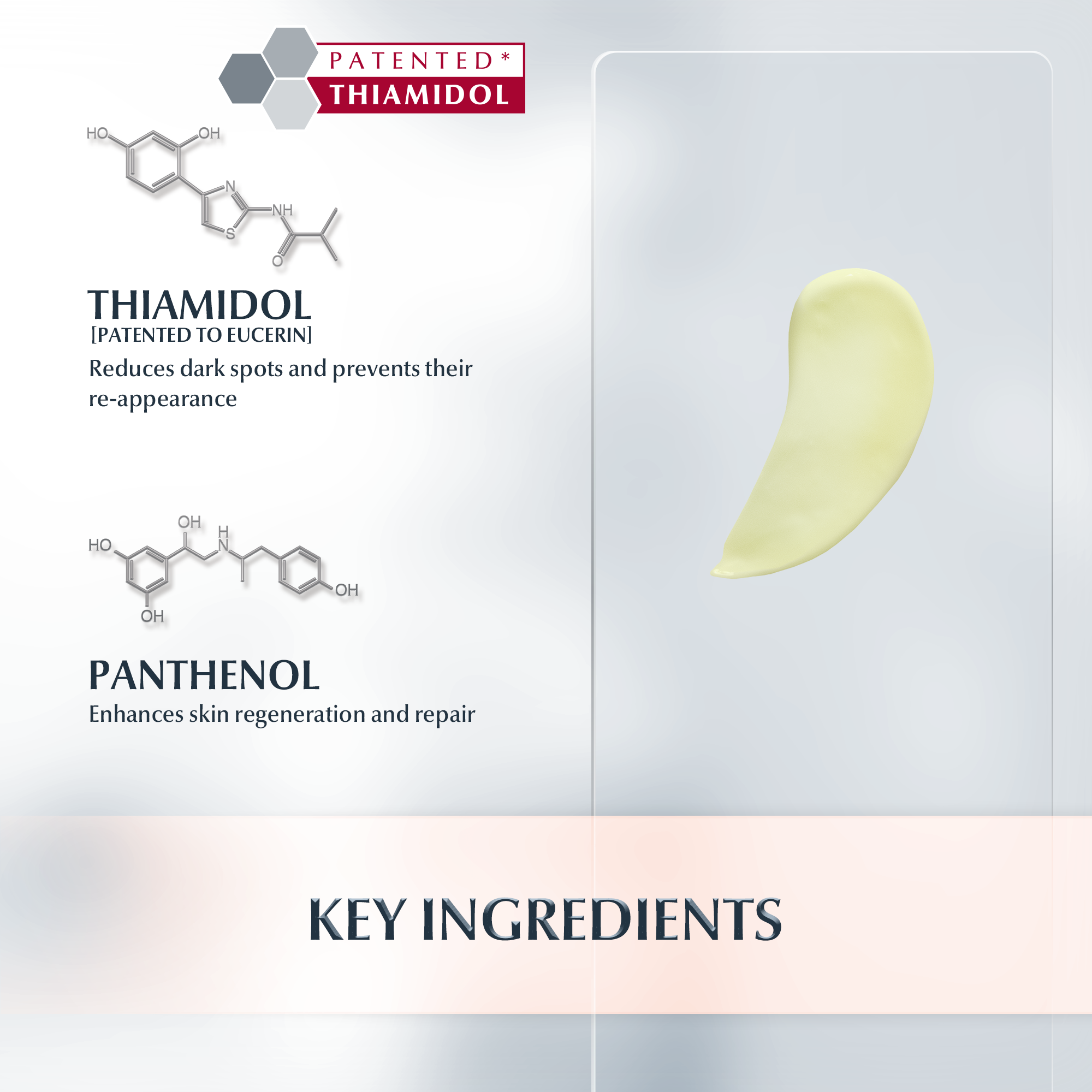 Eucerin Anti-Pigment Night contains Thiamidol, an effective and patented ingredient that acts at the root cause of hyperpigmentation by reducing melanin production. It is clinically and dermatologically proven to reduce dark spots and prevent their re-appearance. First results are visible after two weeks and improve continuously with regular use.