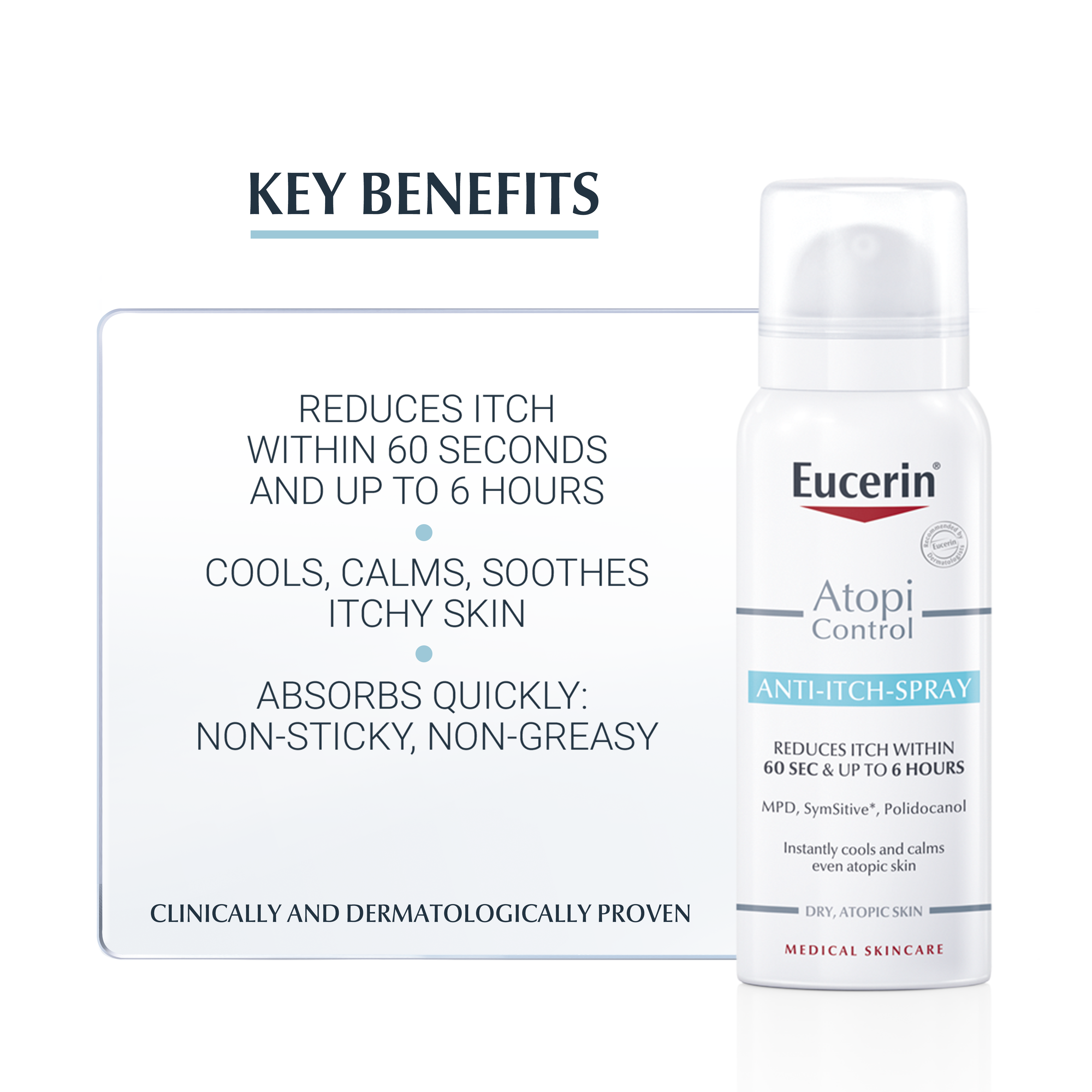 Eucerin AtopiControl Anti-Itch-Spray has been specially formulated to deliver both immediate and long-lasting itch relief. It is clinically proven to reduce symptoms of itchy skin within 60 seconds with results that last for up to six hours.1
