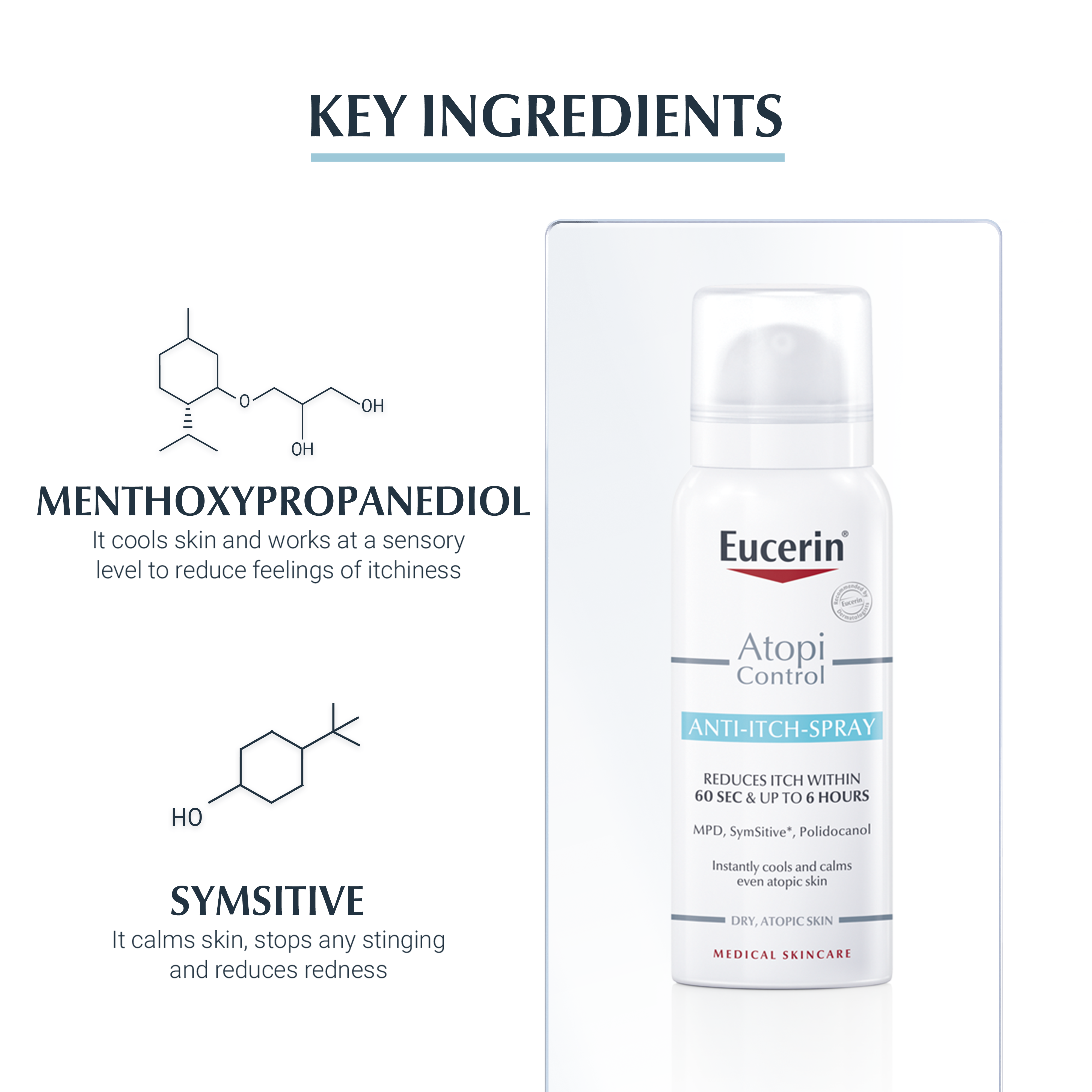 The key actives in Eucerin AtopiControl Anti-Itch-Spray are Menthoxypropandiol, SymSitive* and Polidocanol: