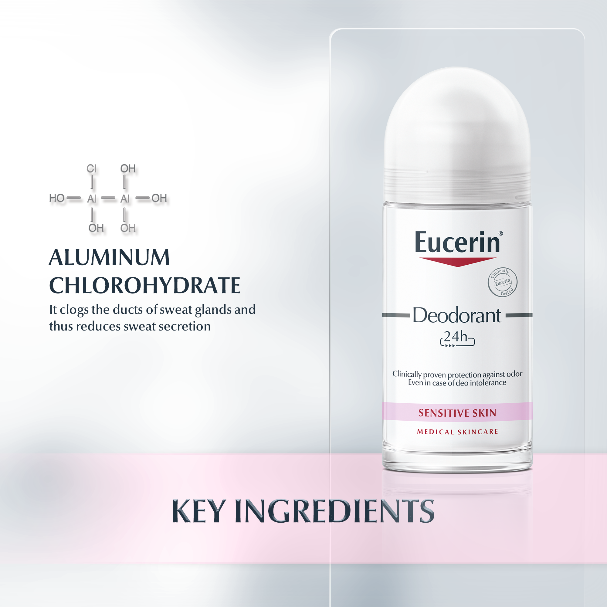 Deodorants do not prevent sweat, but fresh sweat doesn’t smell – it’s only when bacteria gets to work on it that odor forms. The Eucerin formulas contain a small amount of Aluminium Chlorohydrate which reduces the amount of sweat produced as well as substances which reduce the amount of bacteria and restore skin to its natural, midly acidic pH to slow down the growth of that odor-producing bacteria.