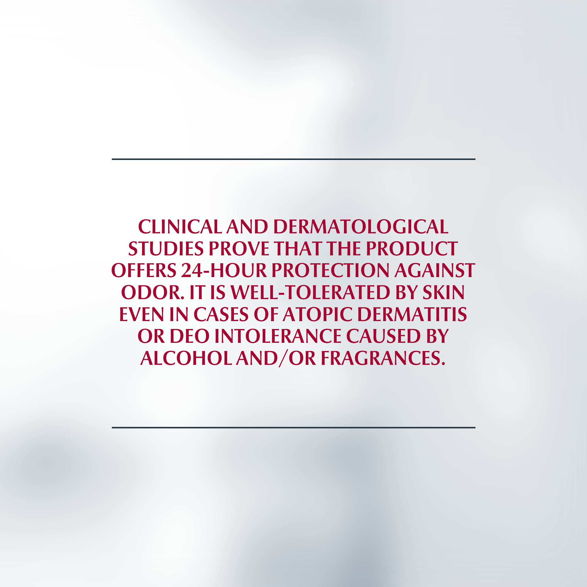 Clinical and dermatological studies prove that the product offers 24-hour protection against odor. It is well-tolerated by skin even in cases of Atopic Dermatitis or deo intolerance caused by alcohol and/or fragrances.
