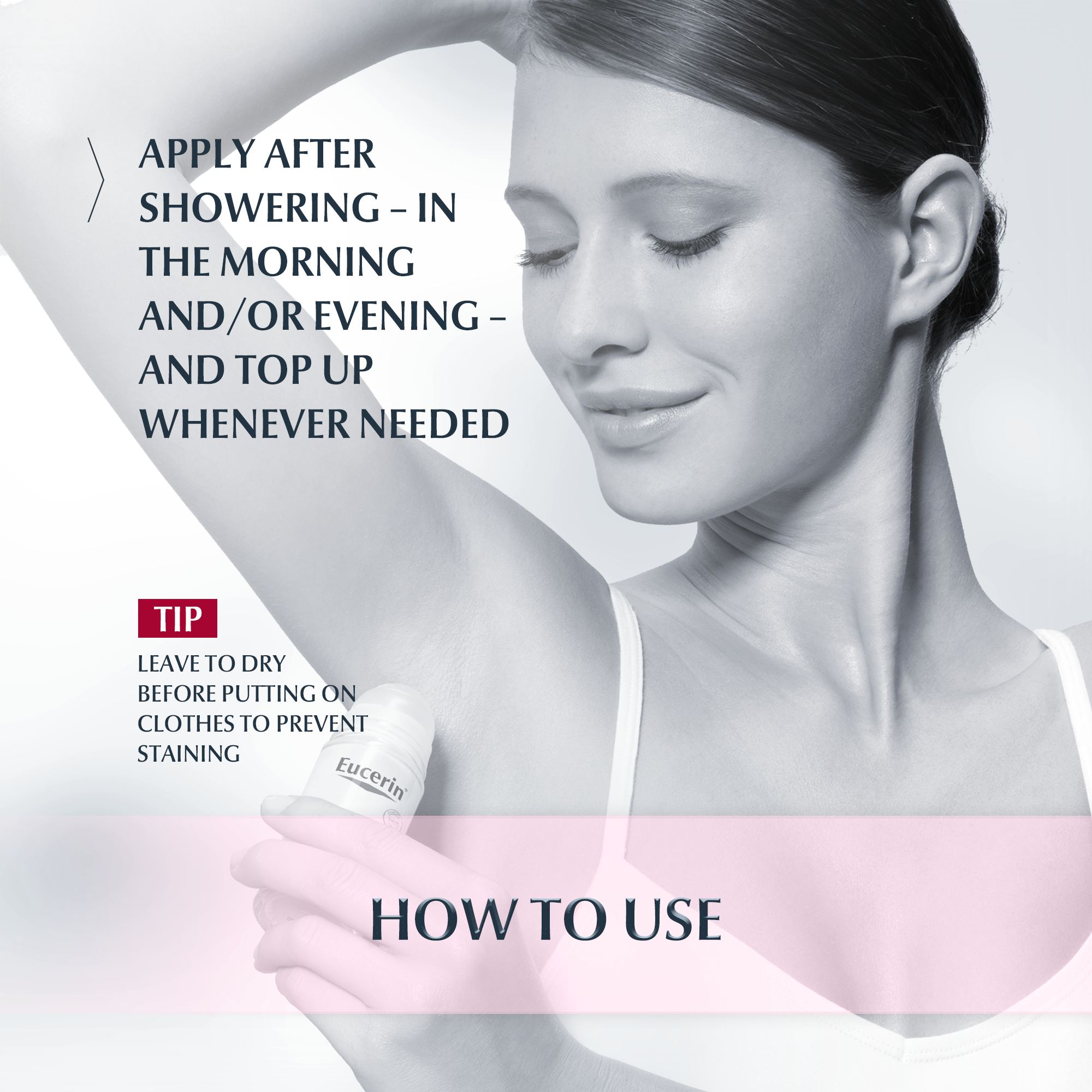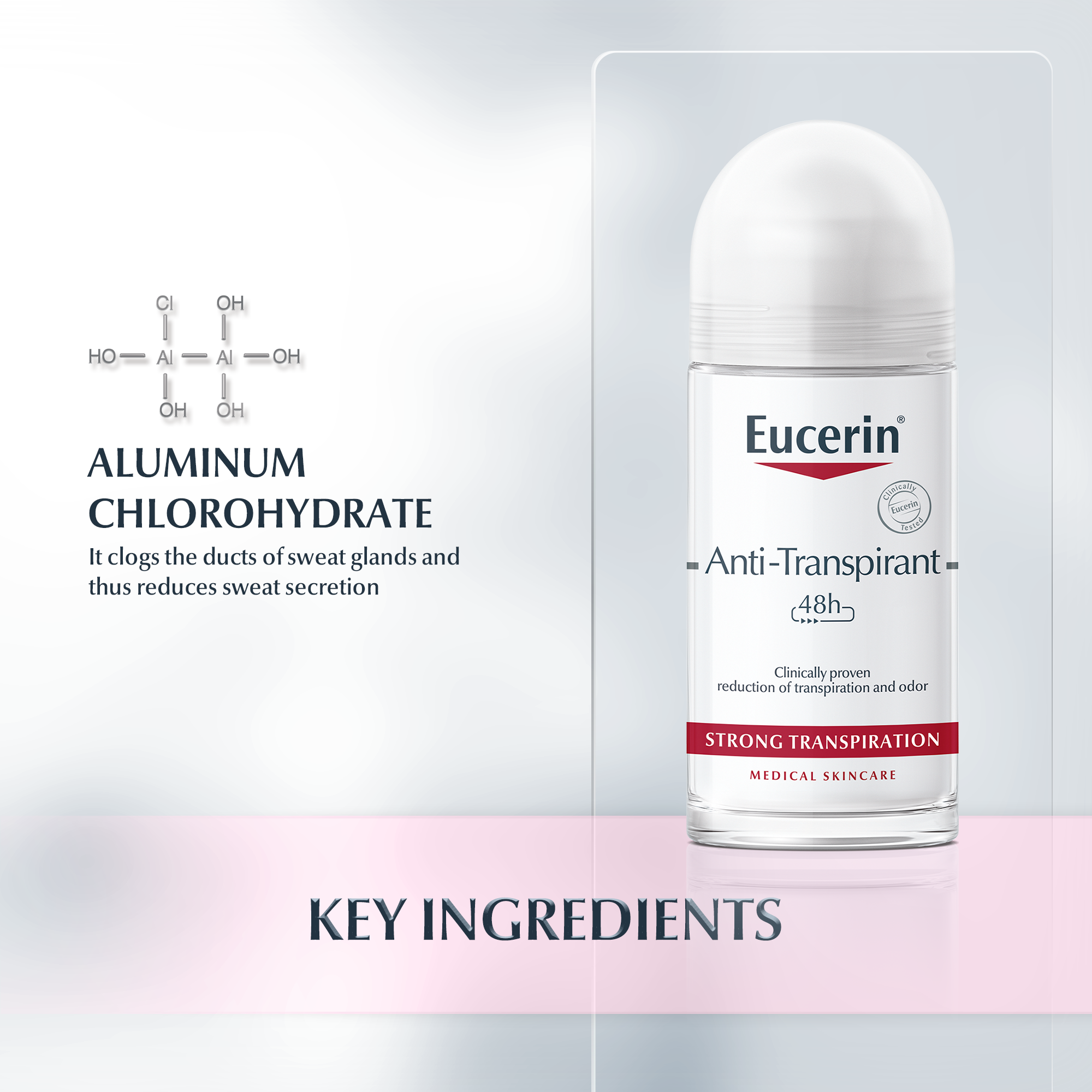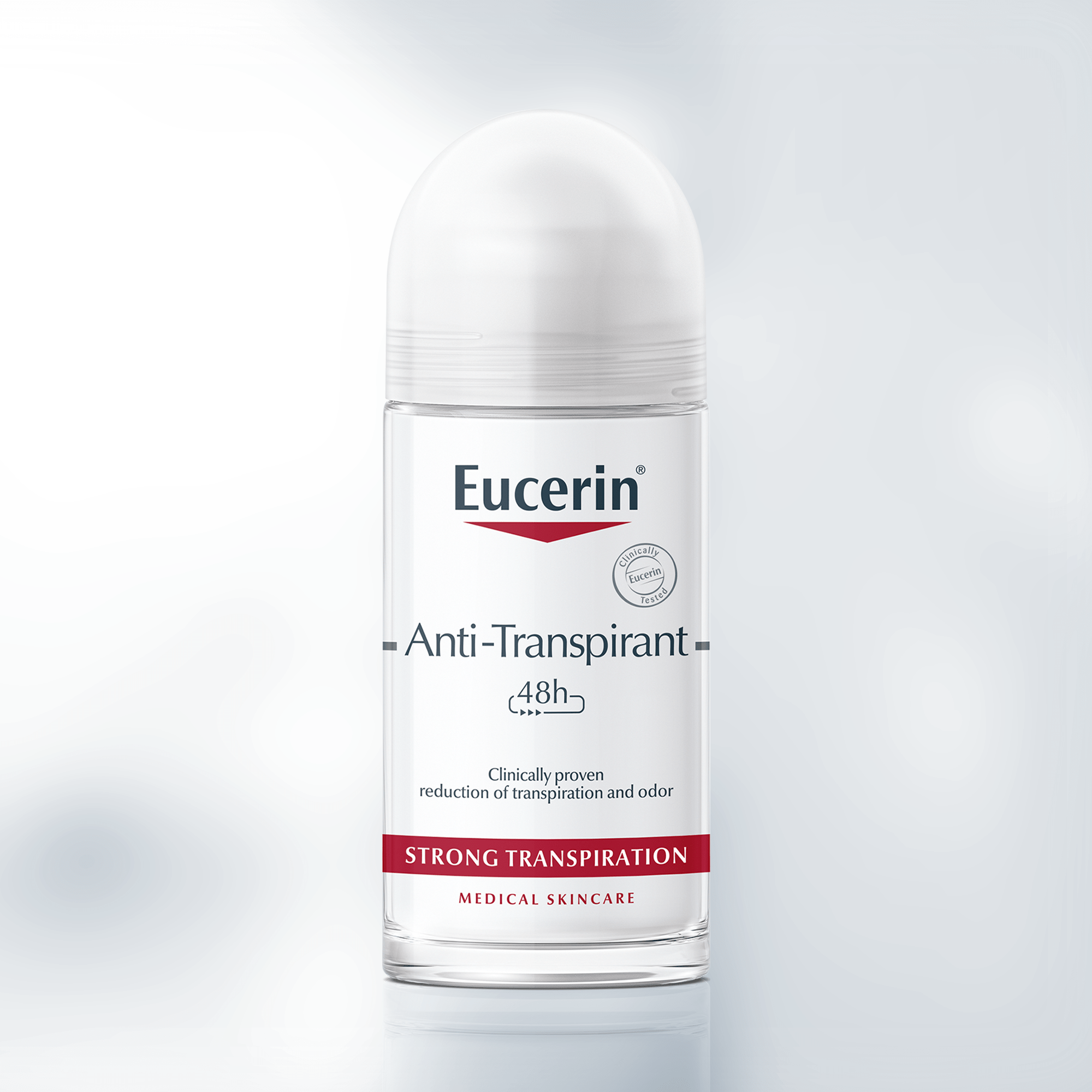 Eucerin 48h Anti-Transpirant Roll-On reduces sweat production for 48 hours.