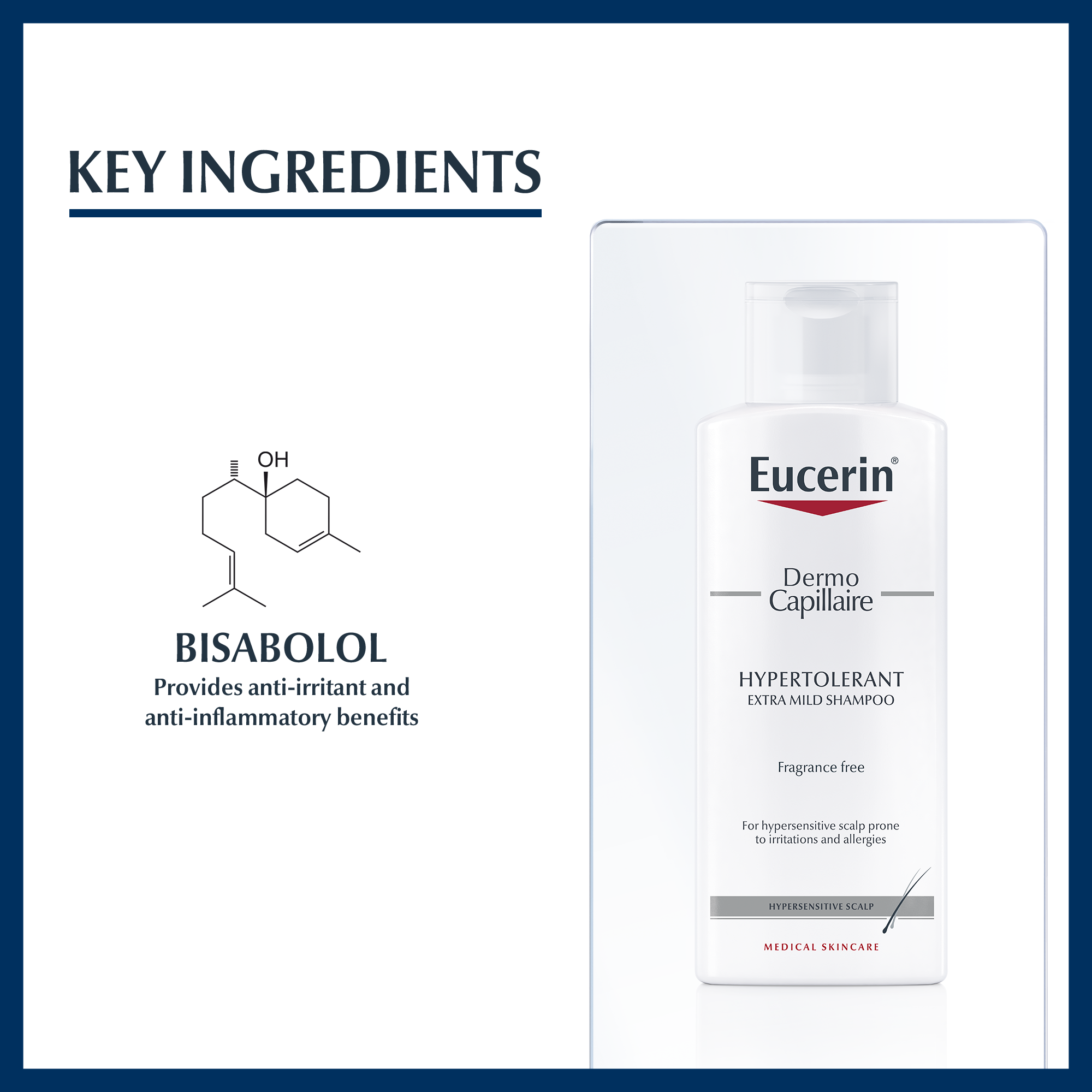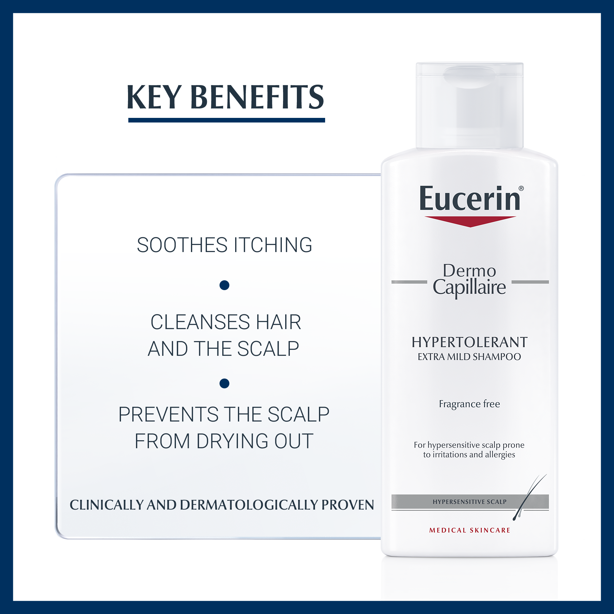 - Your scalp is prone to irritation and allergies: Eucerin DermoCapillaire Hypertolerant Shampoo’s extra-mild formula makes it suitable for use even if you have a hypersensitive scalp.