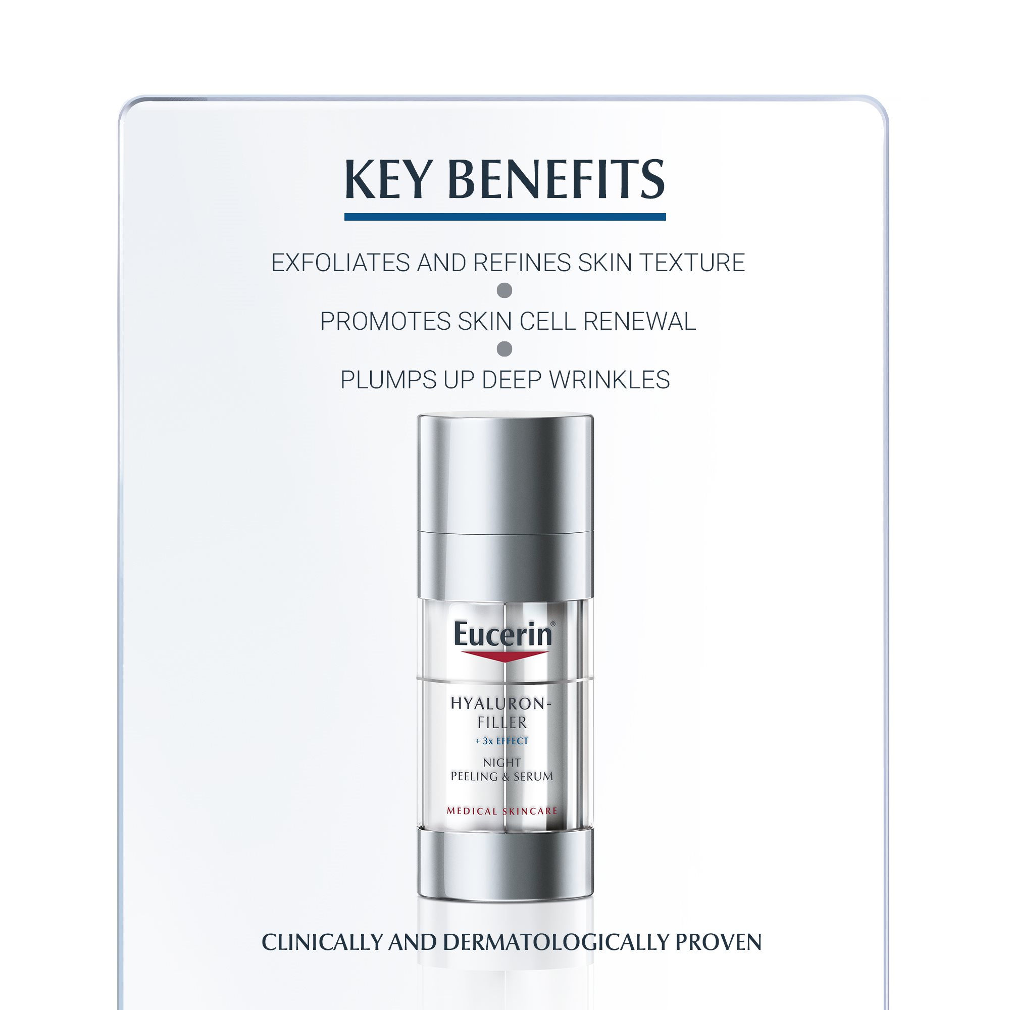 The two formulas combine on your skin to make it feel smooth. This innovative product is designed to be used overnight and, when used regularly, Eucerin Hyaluron-Filler Night Peeling & Serum is clinically and dermatologically proven to refine skin texture and promote skin cell renewal while plumping up even the deepest wrinkles. Skin is smoother and more radiant and pores are refined.