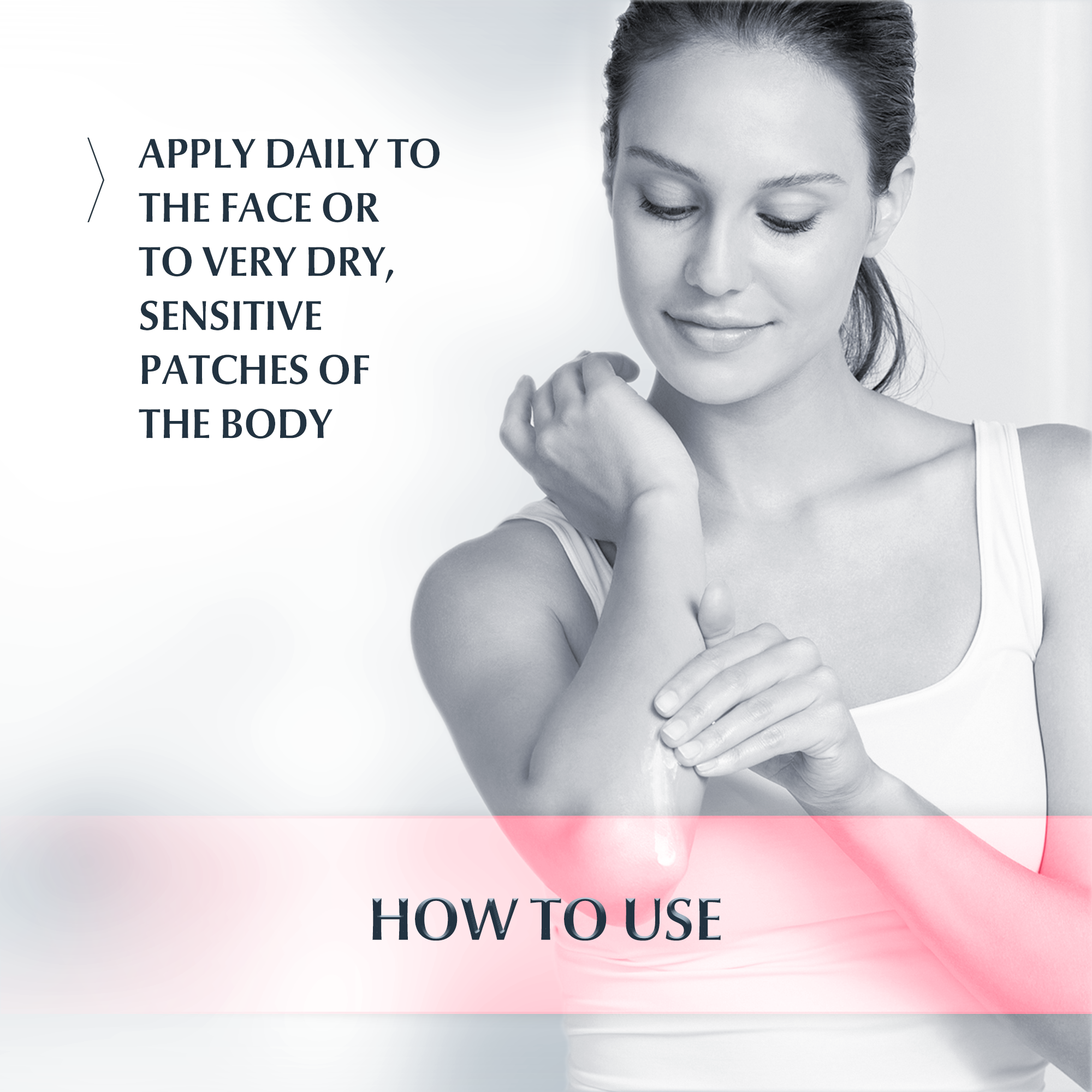 • Use as a daily face cream or apply daily to patches of very dry sensitive skin on the body.