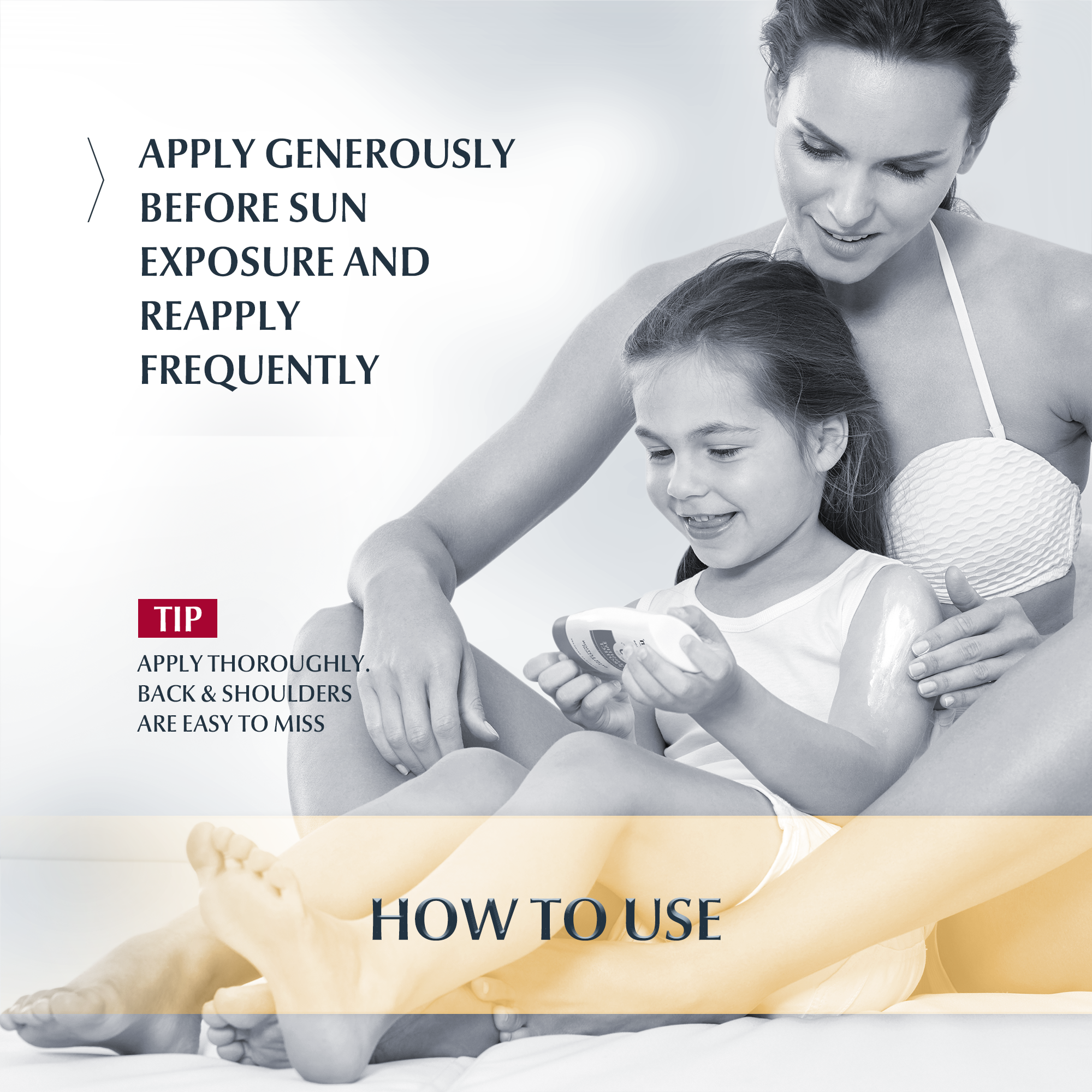 Cover young skin with protective clothing wherever possible and be sure to use sufficient sun protection product on any uncovered areas. A recent Eucerin study2 revealed that 88% of parents use less than the recommended amount of product on their children.
