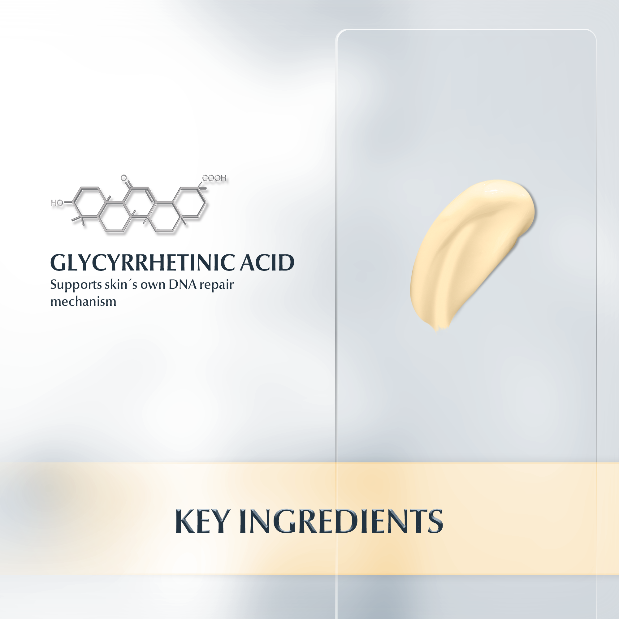 Powerful antioxidant Glycyrrhetinic Acid supports skin’s own DNA repair mechanism.