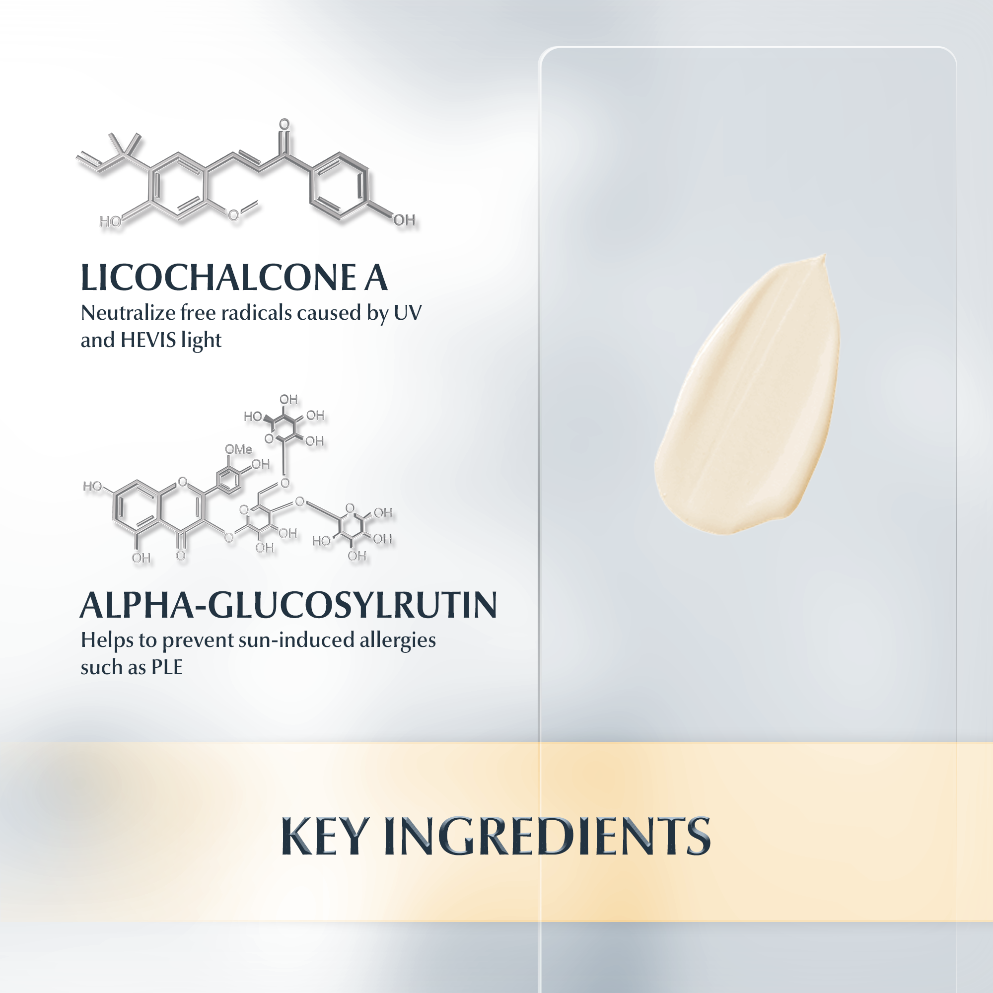 Eucerin’s Advanced Spectral Technology offers high factor UVA/UVB protection and HEVIS light defense. Alpha-Glycosylrutin helps to prevent sun-induced allergies such as PLE.