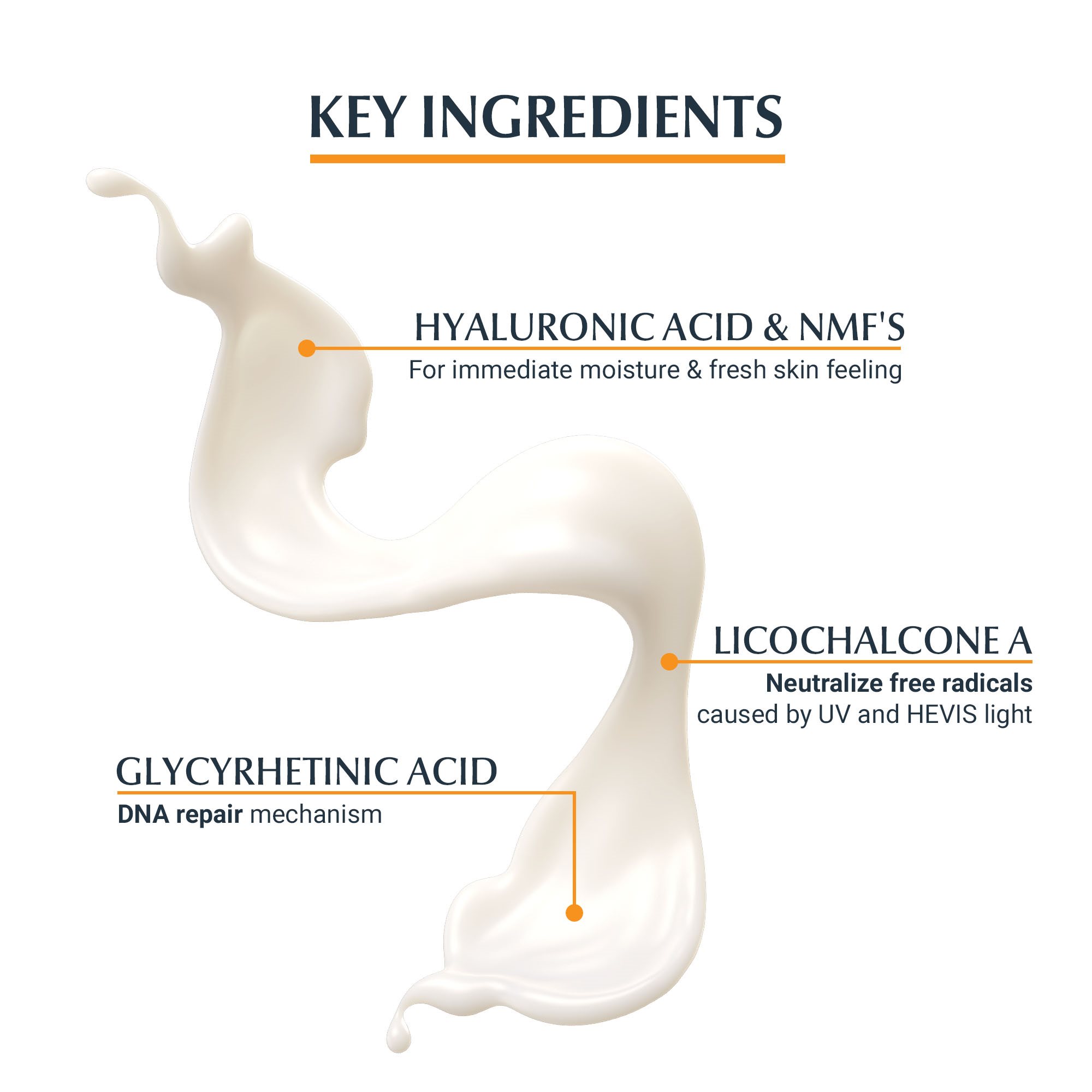 Eucerin® Sun protection innovation with advanced spectral technology combines UVA/B filters for very high UV protection and Licochalcone A for neutralization of free radicals induced by UV and high-energy visible light. Glycyrrhetic Acid supports skin's own DNA repair mechanism.