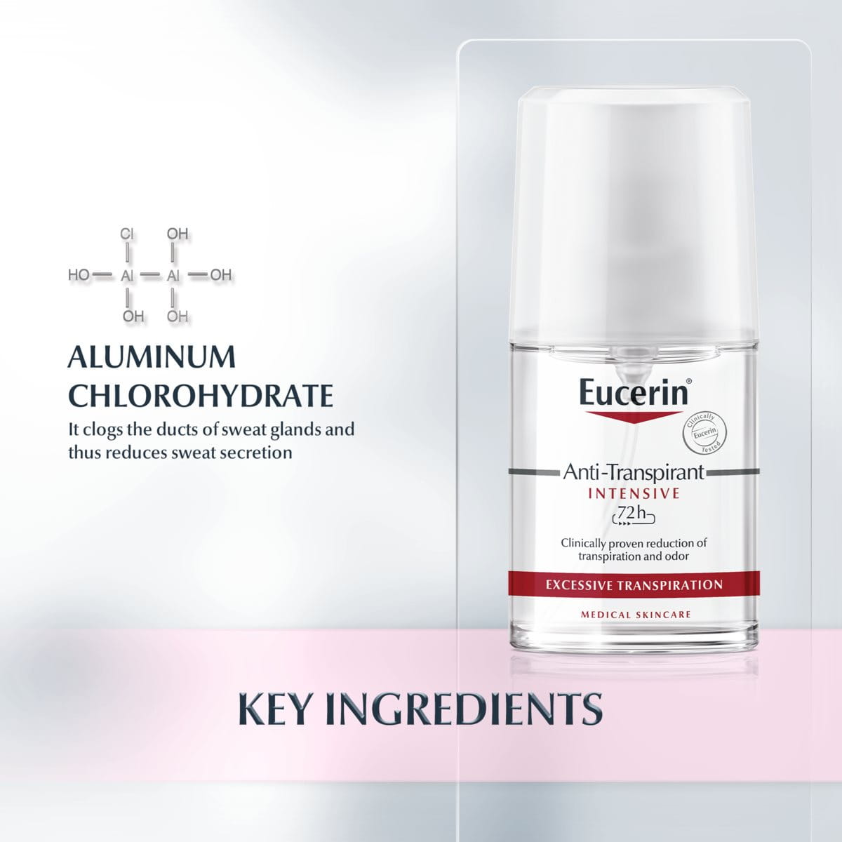 Antiperspirants act on the eccrine and apocrine sweat glands, reducing sweat secretion. Because there’s less sweat you’ll notice less dampness and less odor. Antiperspirants contain active substances such as Aluminium Chlorohydrate (ACH) and Aluminium Chloride (AC). Eucerin 48h Anti-Transpirant Roll-On contains ACH and Eucerin 72h Anti-Transpirant Intensive Pump Spray contains both ACH and AC. AC molecules are smaller and have a lower pH value than ACH molecules so they can get even deeper into the sweat ducts and keep them closed for longer. Even small quantities of antiperspirant can effectively reduce sweating. You can read more about how deodorants and antiperspirants work in sweating – what it is and how it affects people.
